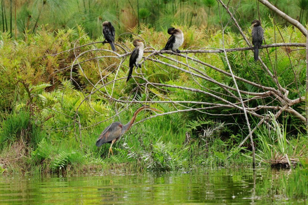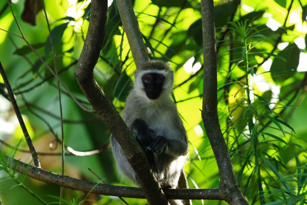 Na een verkwikkende nachtrust in dit tropische paradijsje en een lekker ontbijt komt onze chauffeur Aniny ons oppikken voor onze eerste uitstap naar het Dulutimeer. Met een kano begeleid door een lokale gids varen we rond dit kratermeer en zien er aalscholvers, kleurrijke ijsvogels, drukdoende wevertjes en een koppel majestueuze visarenden. Troepen aapjes genieten van de vele vruchten in de bomen rond het meer. Vlakbij de oever liggen ook 2 grote monitorhagedissen te luieren of liggen ze op prooi te wachten? Tegen de middag keren we terug naar de Lodge waar we op het terras lunchen en de rest van de dag genieten van de mooie omgeving. Morgen vertrekken we op onze eerste safari van deze reis.