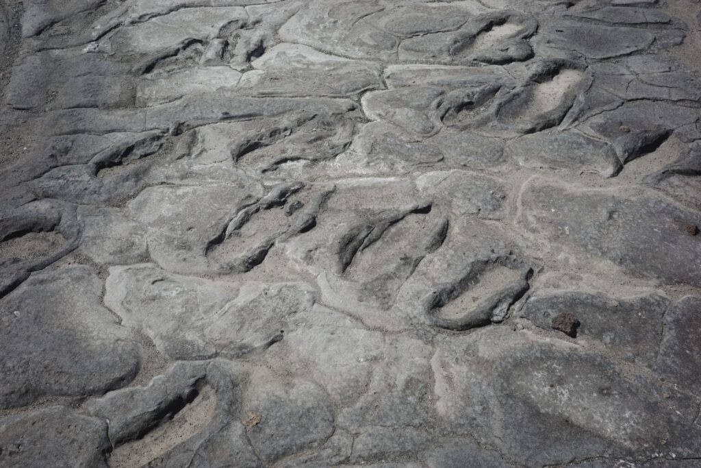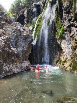 De volgende ochtend rijden we naar “de eerste voetstappen van de mensheid”, versteende voetstappen van meer dan 10.000 jaar geleden. Een eindje verder start onze wandeling door een vulkanische kloof, richting een waterval. We steken meermaals de rivier over waarbij het water tot aan onze middel reikt. Dit is een zalige verkoeling. Na een klim van een uur komen we bij de waterval waar we genieten van een verfrissend bad.