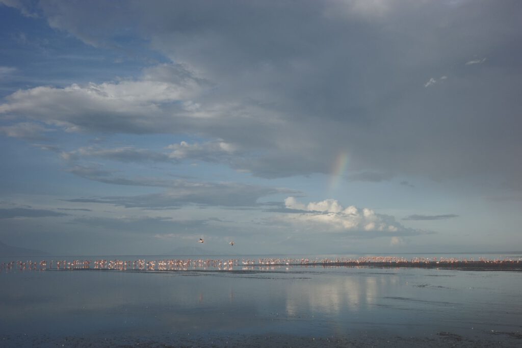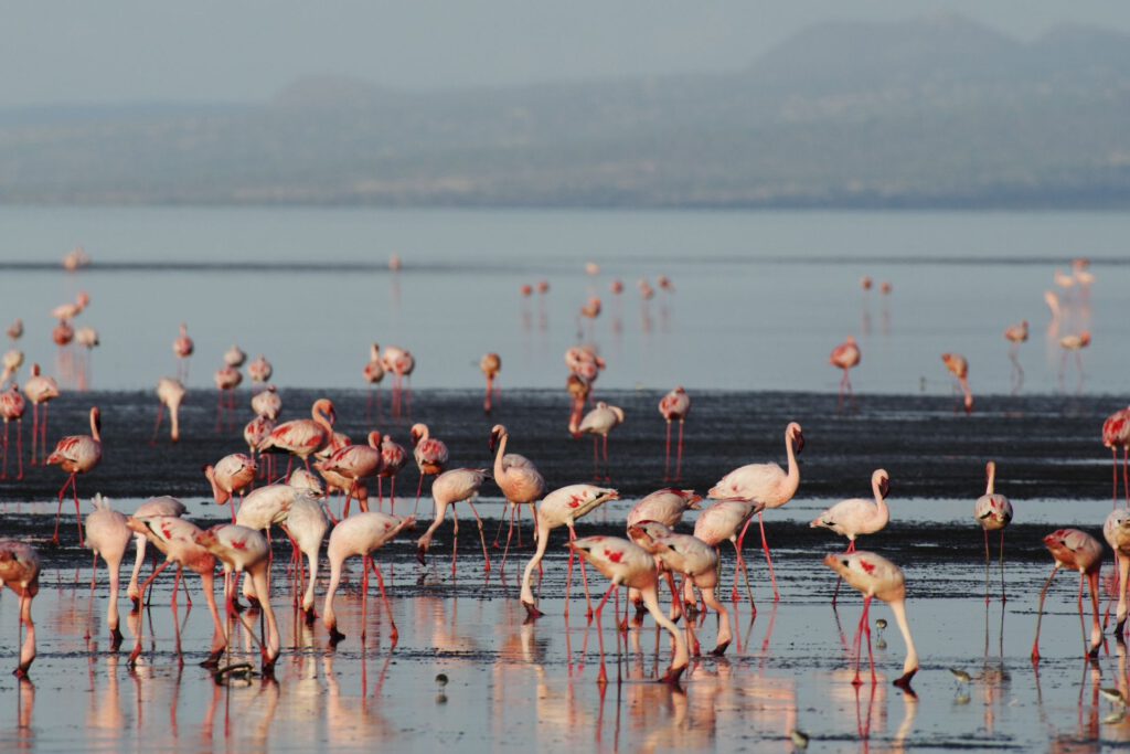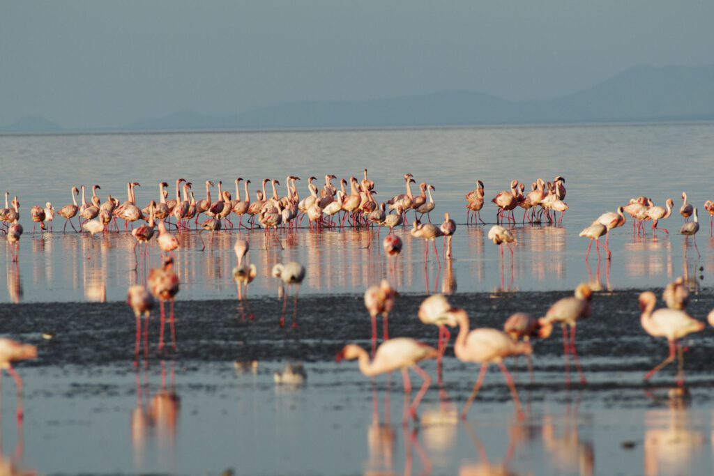 Tegen de late namiddag gaan we op stap met een gids naar de rand van het meer. In deze periode van het jaar komen tot wel 2,5 miljoen flamingo’s hier bijeen om te paren en te broeden. We zien groepjes flamingo’s zeer dicht bij elkaar bewegen in hun beroemde paringsdans: een echt spektakel!