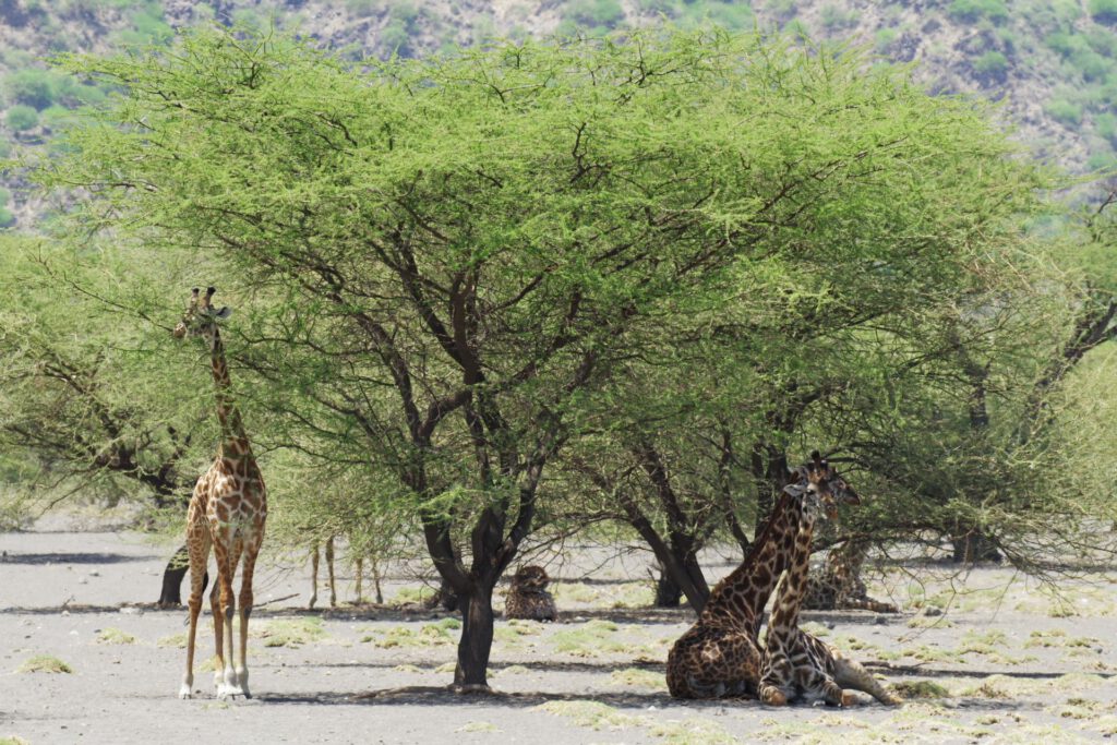 Op de terugweg rijden we langs Masai dorpjes en zien we verschillende giraffen, waarvan er verschillende al zittend onder een boom. Zittende giraffen; dat hadden we nog nooit gezien!