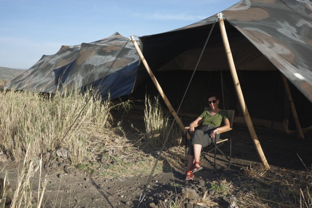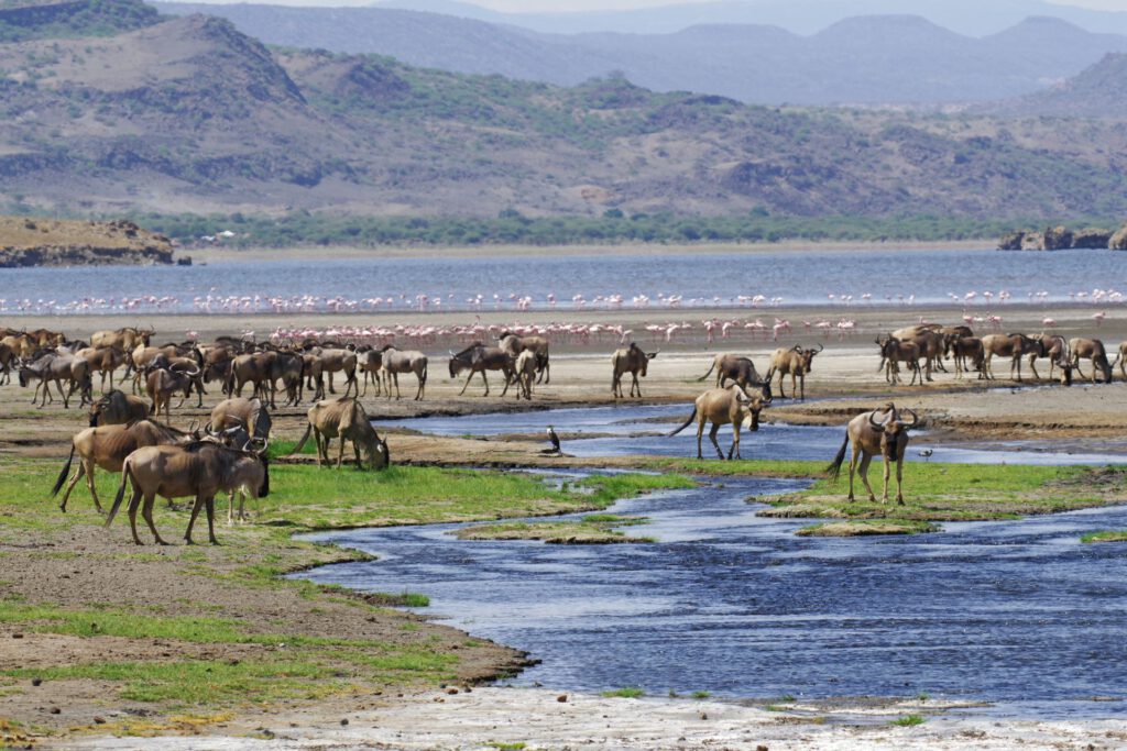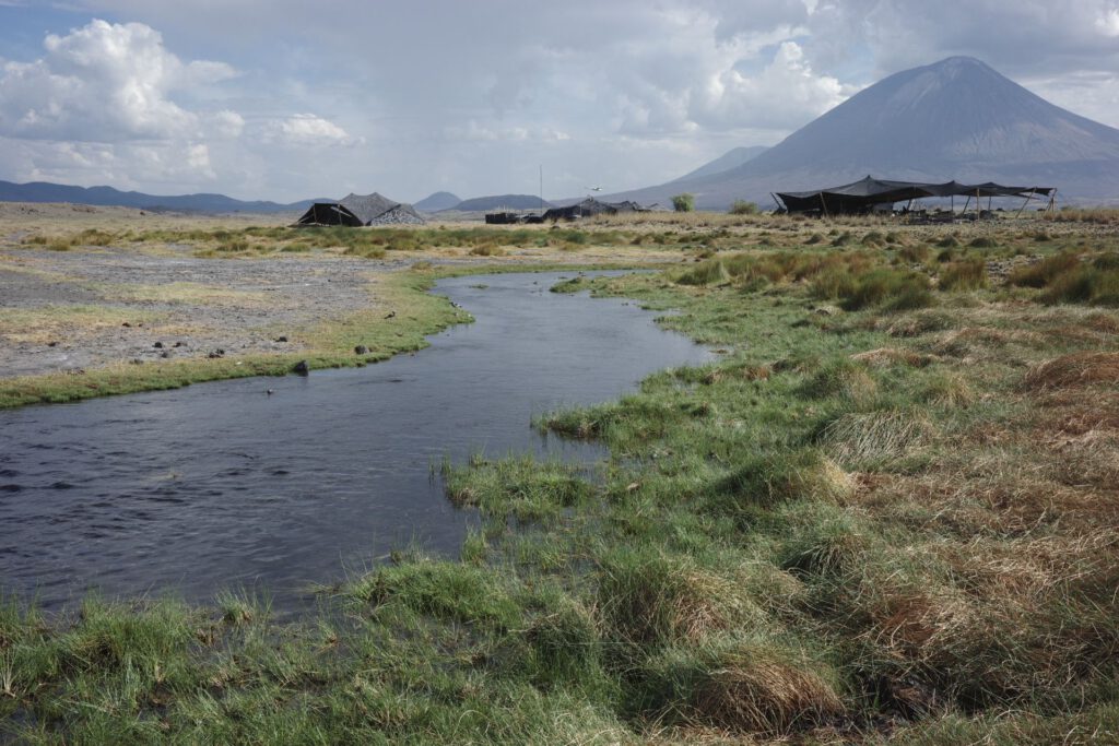Het landschap wordt hier terug groener, dankzij de riviertjes die uit de bergen rondom naar beneden stromen. Onze eindbestemming, Lake Natron Camp, is een echte verrassing; het kamp ligt aan het meer met duizenden flamingo’s. De tenten staan opgesteld tussen de stroompjes die het meer voeden, waarin vele watervogels zich tegoed doen aan de overvloedige visjes. Een kudde zebra’s en gnoes staan tussen de tenten te grazen. Het is hier heet, maar wonderbaarlijk mooi.