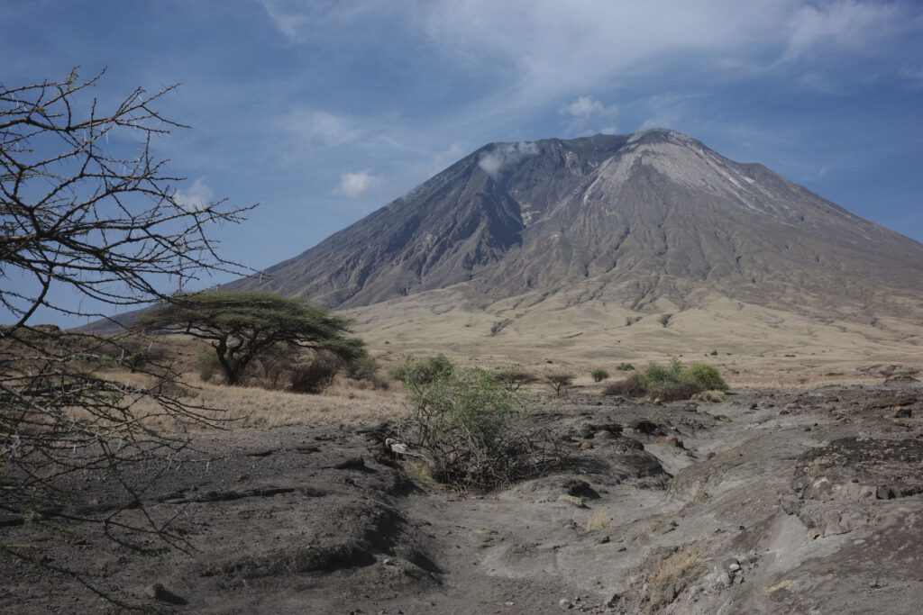 Eindelijk zien we de vulkaan Ol Doinyo Lengai opdoemen, een actieve vulkaan vlakbij het alkalische Natron Meer.