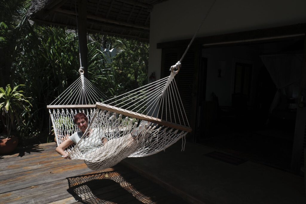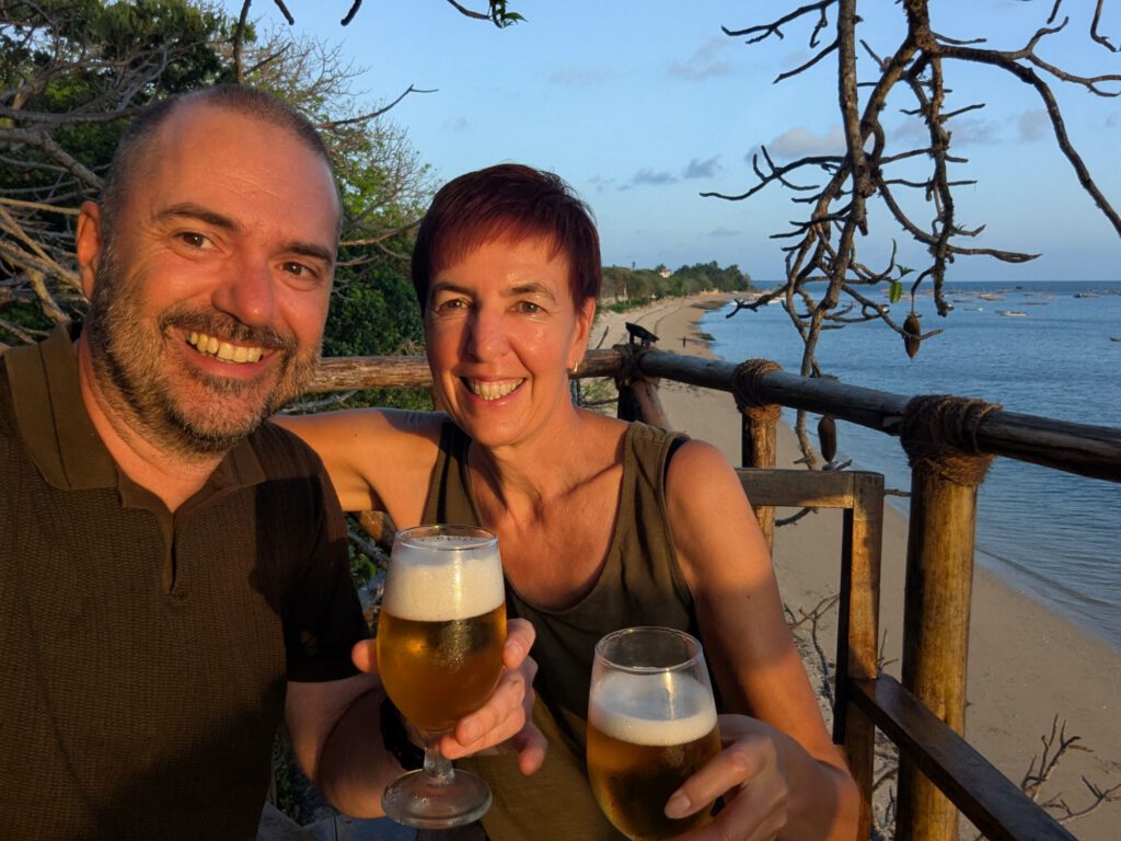 Als we terug aan onze hut komen zit er een troep blue mokeys in de bomen rondom. Het zijn echte deugnieten, want als we even niet kijken is er eentje dat naar binnen glipt om een zakje suiker te stelen. Dat was waarschijnlijk niet de eerste keer, want hij wist precies waar hij moest zijn. In de namiddag lezen en zwemmen we wat en tegen zonsondergang vatten we post in de baobab met een fris Tanzaniaans pintje.