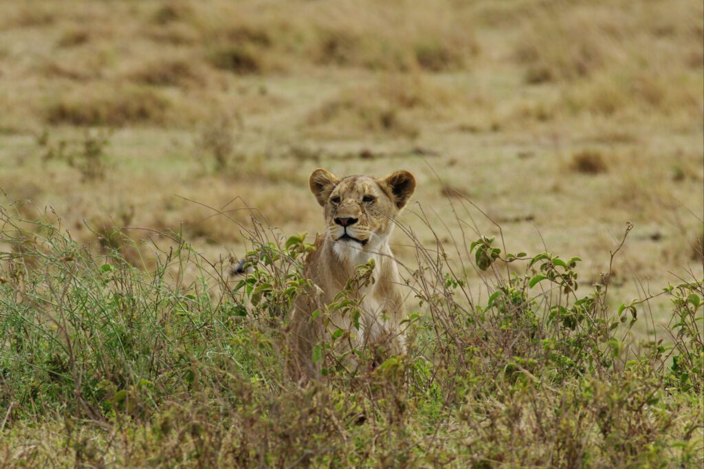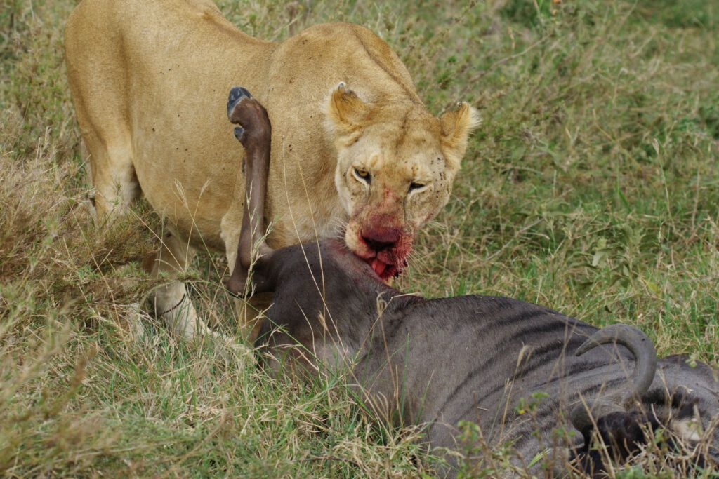 Boven de grote kudde gnoes verderop krioelt het van de zwaluwen, net libellen boven een poel. Er zitten ook veel vogels, waaronder pelikanen, grote flamingo’s en de prachtige kroonkraanvogel. Op de oever van het meer zien we nijlpaarden met een jong. Uit het hoge gras komen twee leeuwen gelopen, een vrouwtje en een jong mannetje, waarschijnlijk moeder en zoon. Deze keer hebben we de show voor ons alleen. We komen nog 2 gevlekte hyena’s tegen en gaan op zoek naar de zwarte neushoorn, maar die laat zich niet zien.
