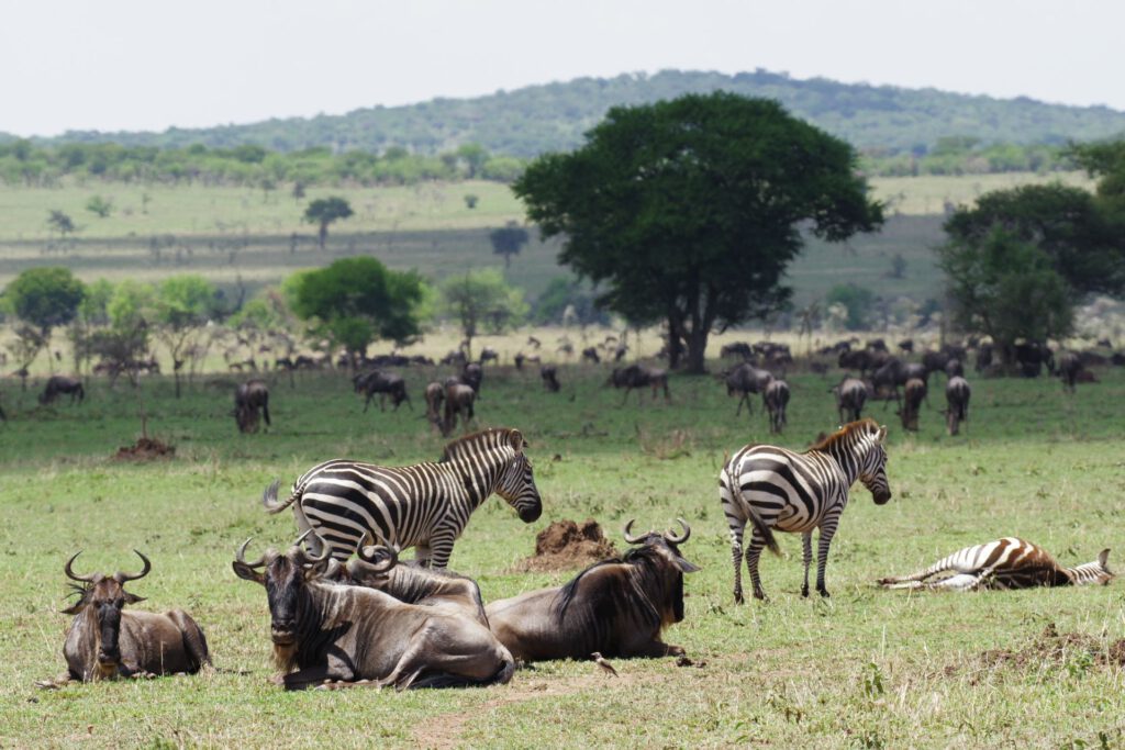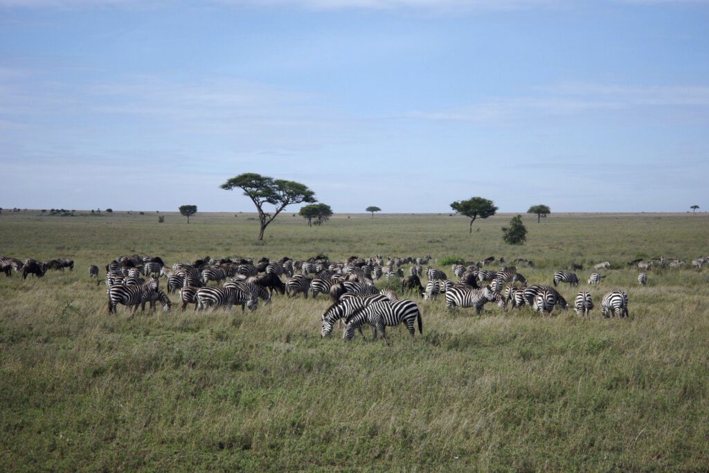 De tweede dag in Serengeti gaan we richting het Westen, waar we hopen een glimp op te vangen van de gigantische kuddes die richting het zuiden aan het trekken zijn. In totaal zouden zo’n 4 miljoen gnoes en 2 miljoen zebra’s van Noord naar Zuid migreren. Doordat het al redelijk groen is, is de kudde opgesplitst, maar de hoeveelheid gnoes die we tegenkomen is toch redelijk indrukwekkend. In het zog van de gnoes lopen de zebra’s; 2 soorten die graag met elkaar optrekken.