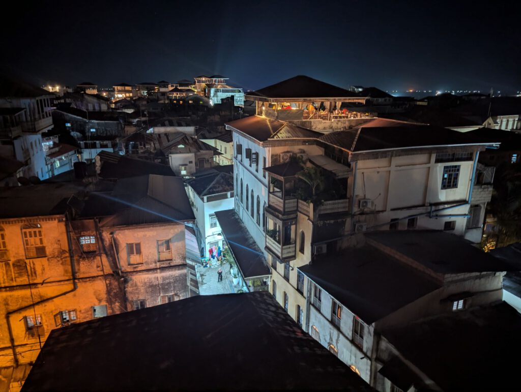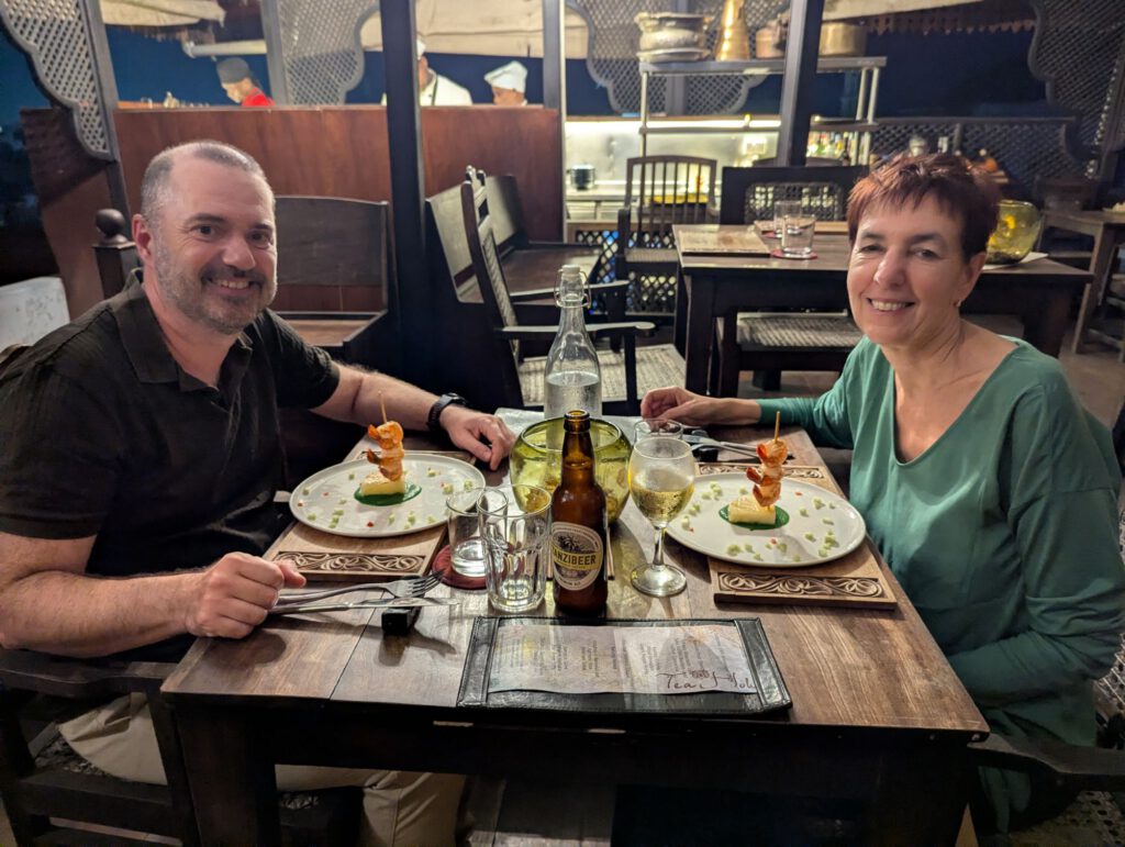 20-11-2025 5:23 pm 2025 Tanzania en Zanzibar, Op reisIn Stone Town, het oude stadsgedeelte van Zanzibar stad, logeren we in het Emerson Spice Hotel, een schitterende koopmanswoning uit de tijd van de kruidenhandel. Het is er niet druk, dus we krijgen een upgrade naar een suite, een gigantische kamer met 2 balkons, vernoemd naar Katherine Hepburn, die hier echter nooit verbleef. En gelukkig is er ook airco, want het is hier tropisch heet. Op het dak van het hotel is een rooftop restaurant gespecialiseerd in vis, heel verzorgd en superlekker! Onze meest culinaire ervaring in Tanzania.