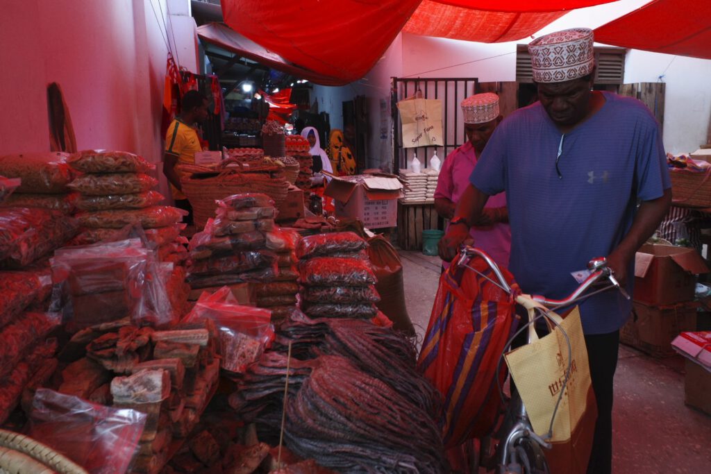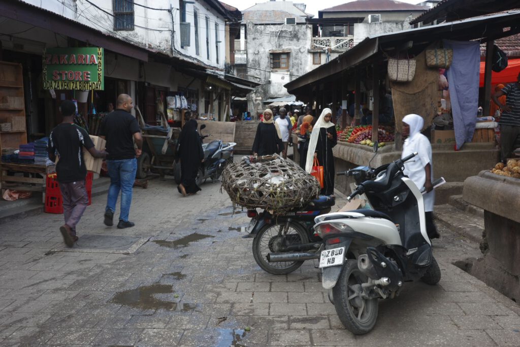 De volgende ochtend gaan we de oude stad ontdekken met een gids. We lopen door de smalle straatjes naar de versmarkt; een zeer levendige markt, waar de inwoners van Zanzibar stad hun inkopen doen; van geurige kruiden, groenten (o.a. gigantische avocados, meer dan dubbel zo groot dan bij ons), tropisch fruit, verse vis tot dode en levende kippen. Onze gids zegt dat hij liever een levende kip meeneemt, want hij eet ook graag de andere onderdelen van het beest (poten, …). Ernaast is er een winkeltje dat ook kippen verkoopt, maar dit zijn ingevroren exemplaren die uit Brazilië worden ingevoerd en die veel goedkoper zijn dan de inlandse kippen, de wereld op zijn kop… Maar volgens onze gids is de smaak navenant.