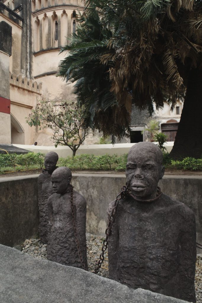 We bezoeken daarna de oude slavenmarkt. Hiervan blijven alleen de kelders over, waar vroeger de slaven werden ondergebracht alvorens ze werden verhandeld, als koopwaar dicht bij elkaar in benauwende omstandigheden. Een beeldhouwwerk van een Scandinavische kunstenaar moet de herinnering aan wat zich hier afspeelde in stand houden. Op de plaats waar vroeger zweepslagen werden gegeven staat nu een anglicaanse kerk. Een interessant museum vertelt de geschiedenis van de slavenhandel in Zanzibar.