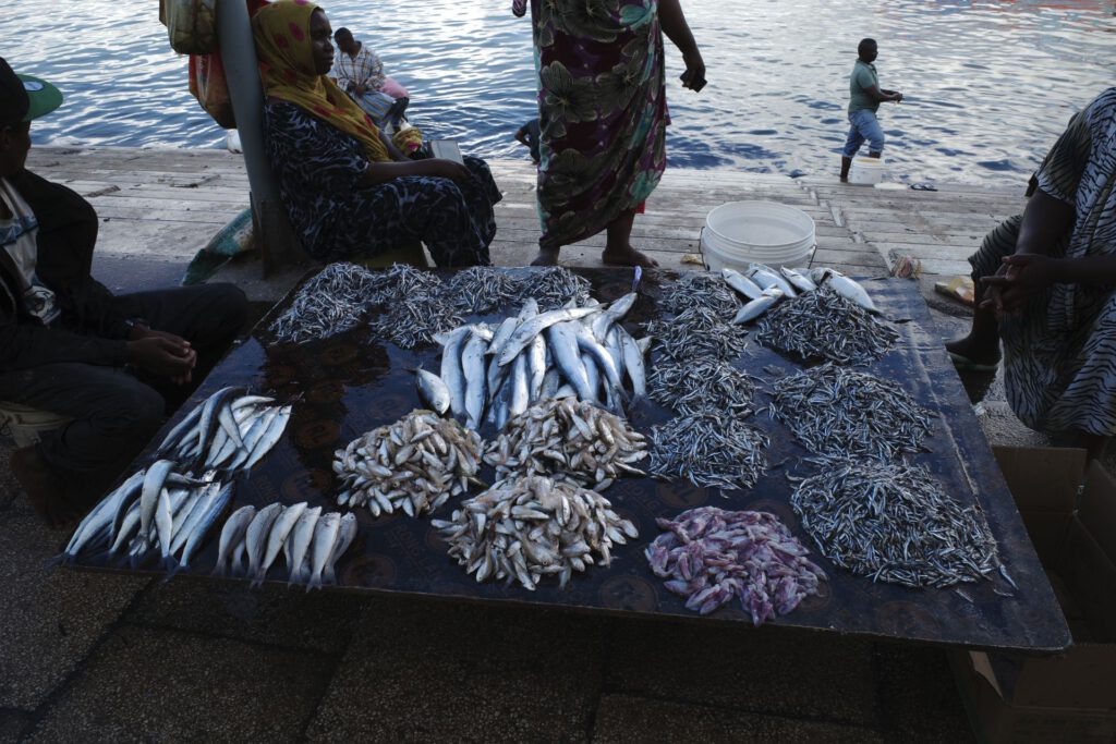 We lunchen bij het water in het Freddy Mercury Café, maar we hebben hier geen muziek van Queen gehoord… 😉 Daarna wandelen we nog wat door Stone Town, ondermeer langs het huis van de bekende slavenhandelaar Tipu Tip, maar ook dit wordt gerenoveerd momenteel. Via het mooie oude dispensarium banen we ons een weg door de massa, die staat aan te schuiven om de ferry naar het vasteland te nemen ( duurtijd 7u, met de catamaran slechts 1,5u). Voorbij de ferry terminal komen we bij de vismijn, waar de vissers hun verse vangst proberen te slijten.
